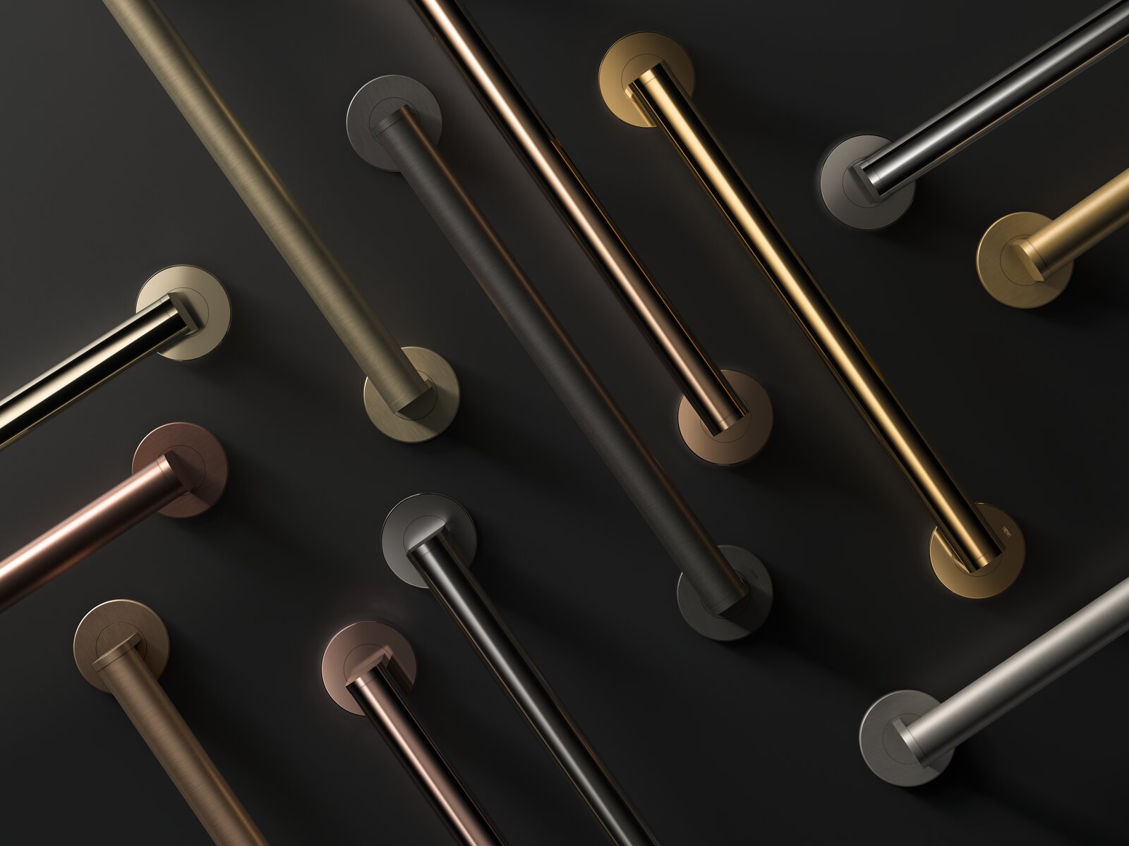 Brass, bronze, gold or black chrome, with the finish options of brushed or glossy – the new metallic designer surfaces offer a wide range of choices. They are highly decorative and emotionally appealing. But behind thefine, shimmering surfaces lie extremely robust and resistant properties. The PVD surfaces are corrosion-resistant, making them ideal for sanitary rooms or rooms with high humidity. They also have durable properties such as hardness and scratch resistance. HEWI offers a total of 4 new standard and 8 new special colours.
