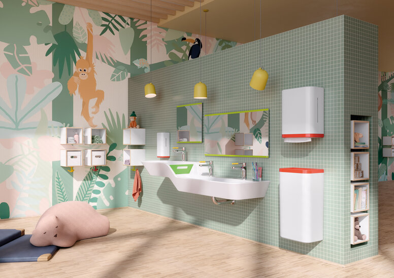 Washbasin types with two or more washing places next to each other offer space for several users at the same time. The double and row washbasins from HEWI are designed for use in nurseries, daycare centres and schools. With their cheerful colours, they invite people to wash their hands and support playful engagement with the element of water. The built-in height and depth adjustment perfectly adapts to the anatomy of the children. Rounded corners and edges protect against knocks and help to ensure that the fittings are easy to reach, even for small users. The washbasins have a non-porous, easy-care and hygienic surface. Even acrylic and finger paints can be removed without leaving any residue.