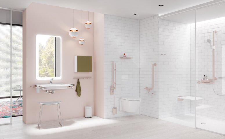 Handen wassen, tanden poetsen, haren föhnen of in de dagelijkse hygiëneroutine - de wastafel is een centraal onderdeel in de badkamer. Vooral omdat wassen aan de wastafel voor veel van uw klanten in de plaats komt van douchen of baden, omdat dit lichamelijk veel inspannender is. Je kunt mogelijke risico's bij de wastafel tegengaan door handgrepen te plaatsen in de directe omgeving van de wastafels van uw klanten. Op deze manier garandeert u hen een veilige stand en wordt aan een dagelijkse gang van zaken met zelfbeschikking bijgedragen. Voordeel bieden bijvoorbeeld wastafels met geïntegreerde handgrepen, die uw klanten het houvastcomfort direct bij de wastafel bieden. Als de ondersteuning niet nodig is, dienen de handgrepen als handdoekrek.