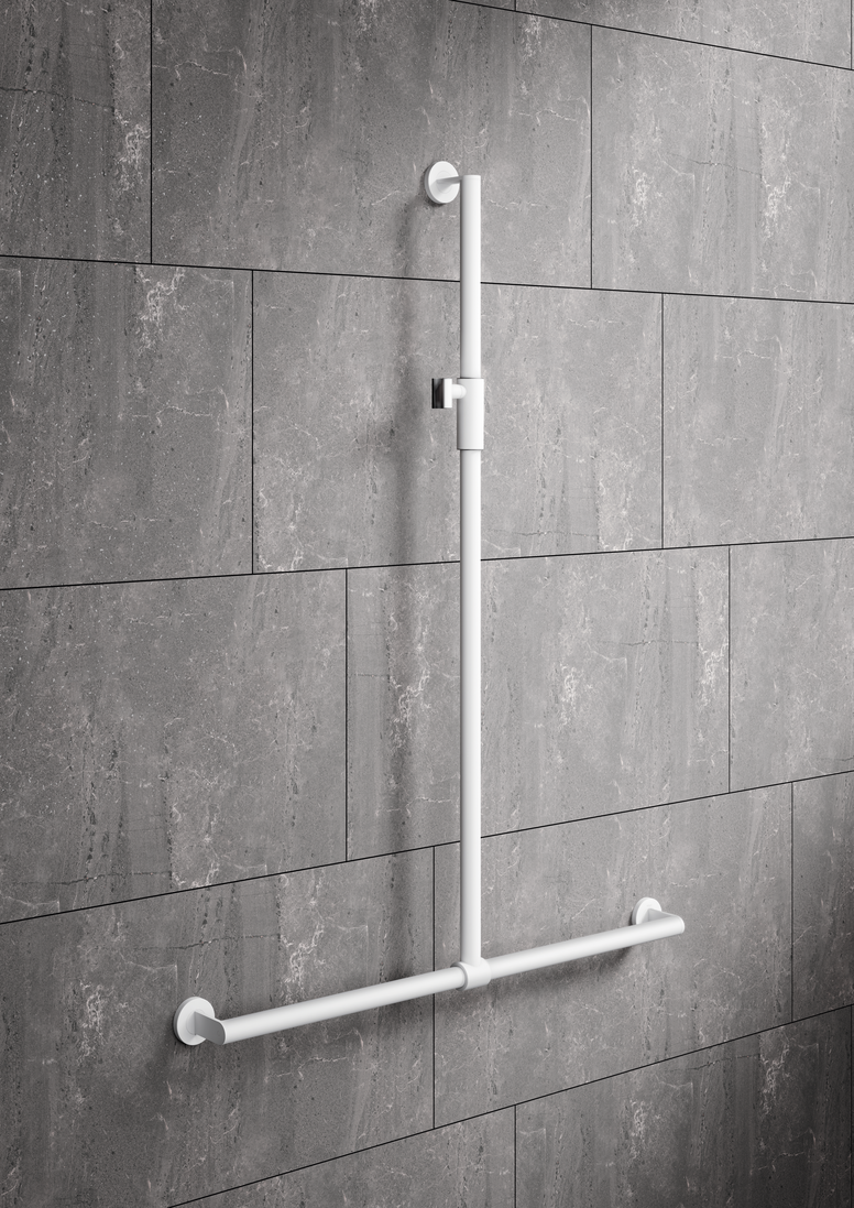 Naast de gebruikelijke handgrepen met twee bevestigingspunten bieden douchegrepen nog een ander voordeel naast meer comfort: Ze combineren douchestang en houvastmogelijkheid. Deze oplossing maakt zowel verticaal als horizontaal vastpakken mogelijk.