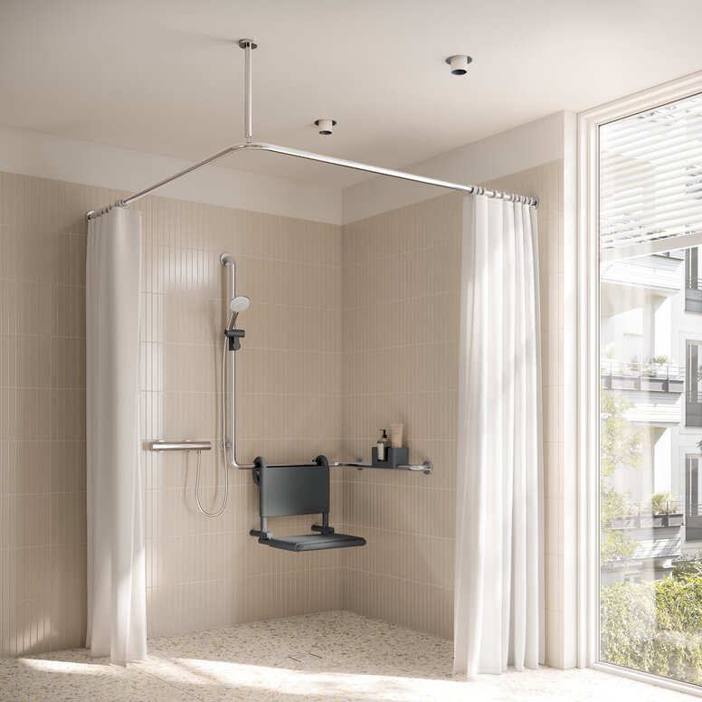 The fittings of the patient bathrooms is a decisive aspect of healing architecture. These should not only be accessible and safe but also create a calming and healing atmosphere. Ergonomically designed elements play an important role in increasing patient comfort. And hygienic and are easy-to-clean materials help control infections and increase well-being. Sophisticated lighting and a pleasant colour scheme also promote relaxation and support healing. A well-designed patient bathroom must fulfil the diverse needs of patients. Products such as support rails, hinged support rails, and seating options offer additional comfort and safety for everyone. These elements not only make everyday hospital life easier for patients but also promote their independence and can relieve the burden on the care staff.