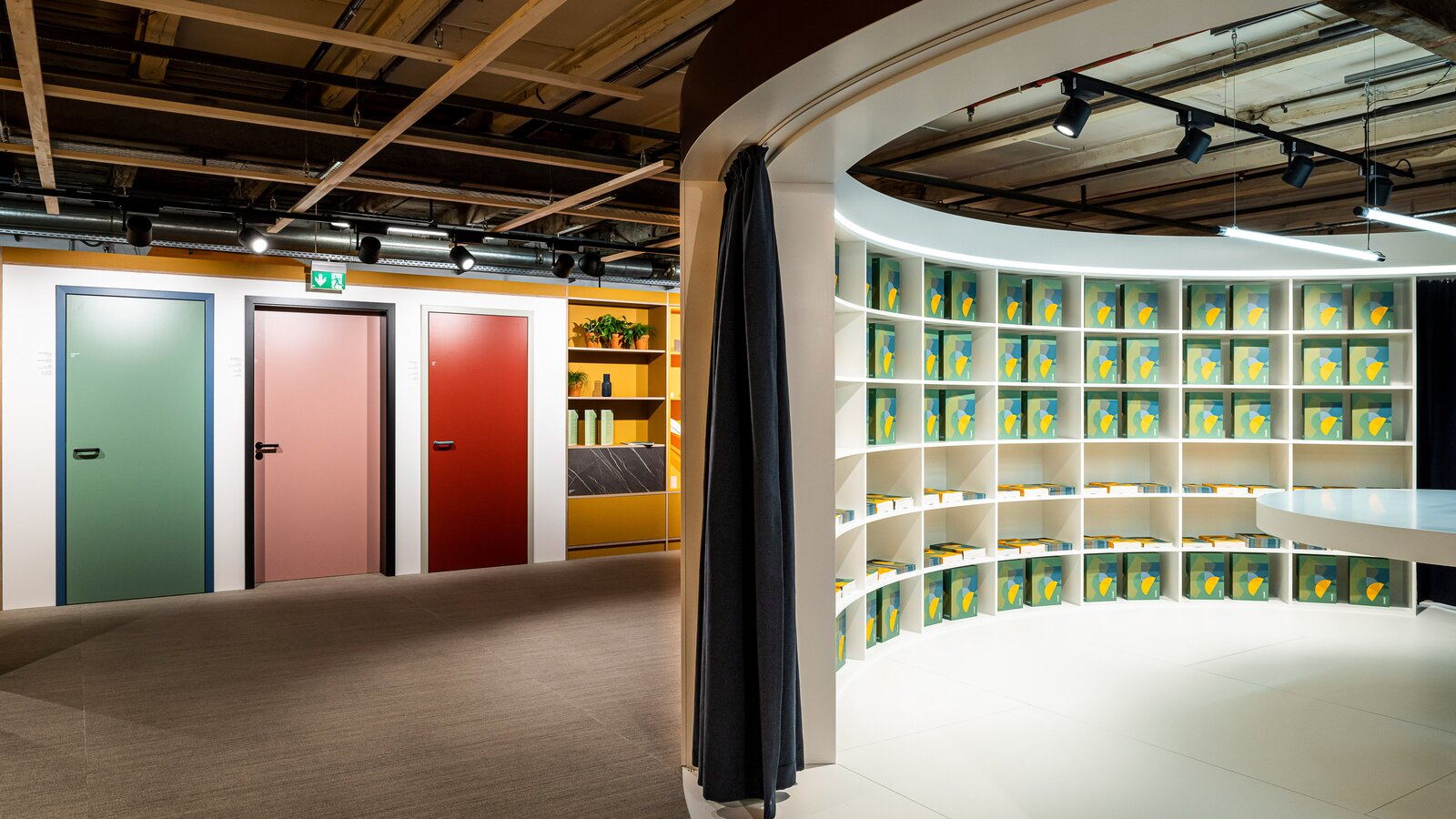 The Westag AG exhibition presents how doors can be harmoniously combined with lever handles. Whether green, yellow, red or pink doors - mini always fits. The minimalist rosette underlines the extraordinary door design of Westag AG.