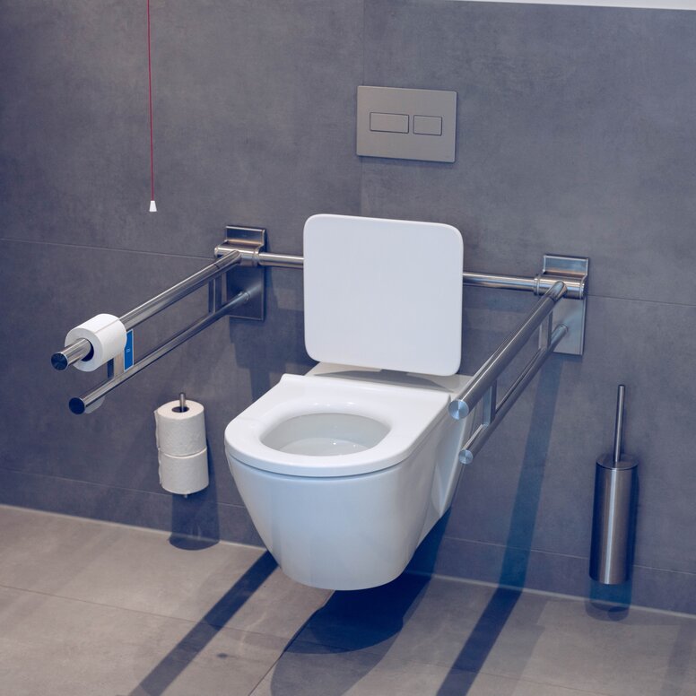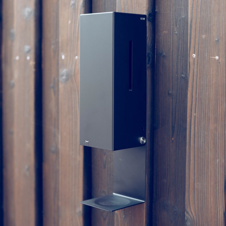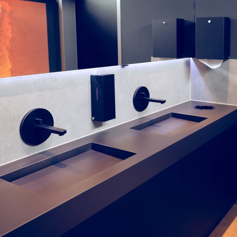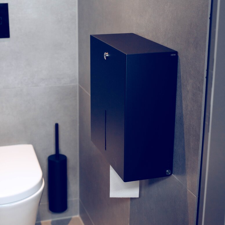 Aby dopasować się do czarnych matowych okuć drzwiowych HEWI, ale także do czarnej armatury łazienkowej i ciemnych powierzchni w nowych pomieszczeniach sanitarnych, wybór padł także na trwałe i wytrzymałe akcesoria HEWI System 900: Zastosowano dozowniki mydła w wariancie HEWI Sensoric, podajniki ręczników papierowych, kosze na śmieci i zestawy szczotek do WC, wszystkie wykonane z wysokiej jakości stali nierdzewnej i malowane proszkowo w kolorze eleganckiej, głębokiej matowej czerni. System 900 spełnia wymagania wielu typologii budynków, szczególnie w miejscach o dużym natężeniu ruchu, takich jak budynki użyteczności publicznej i restauracje, i przekonuje swoją funkcjonalnością, trwałą jakością, przemyślaną techniką montażu i higienicznym wyglądem. Również składana poręcz WC pochodzi z serii 900, która została opracowana głównie z myślą o łazienkach bez barier i przekonuje niezawodną jakością oraz dopracowanymi szczegółami technicznymi.