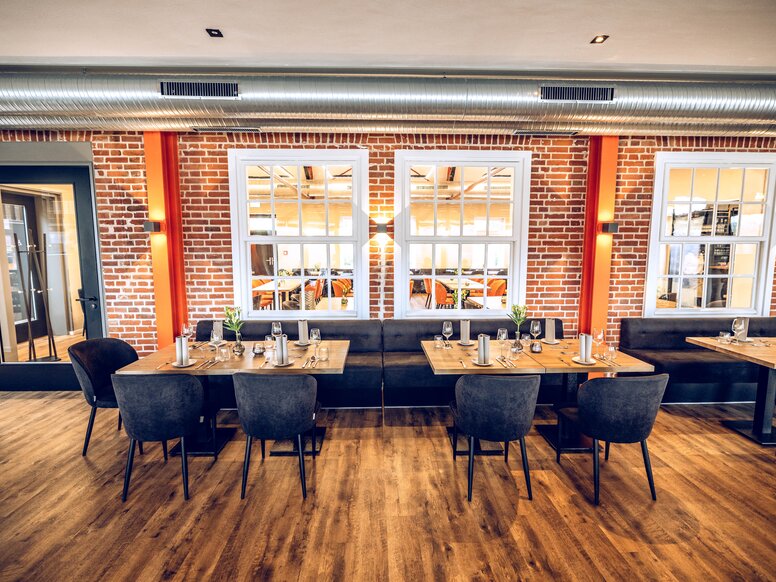 We wnętrzu widać dużą ilość cegły oraz czarnych mebli, elementów wbudowanych i drzwi, co nadaje restauracji klasyczny, industrialny wygląd.