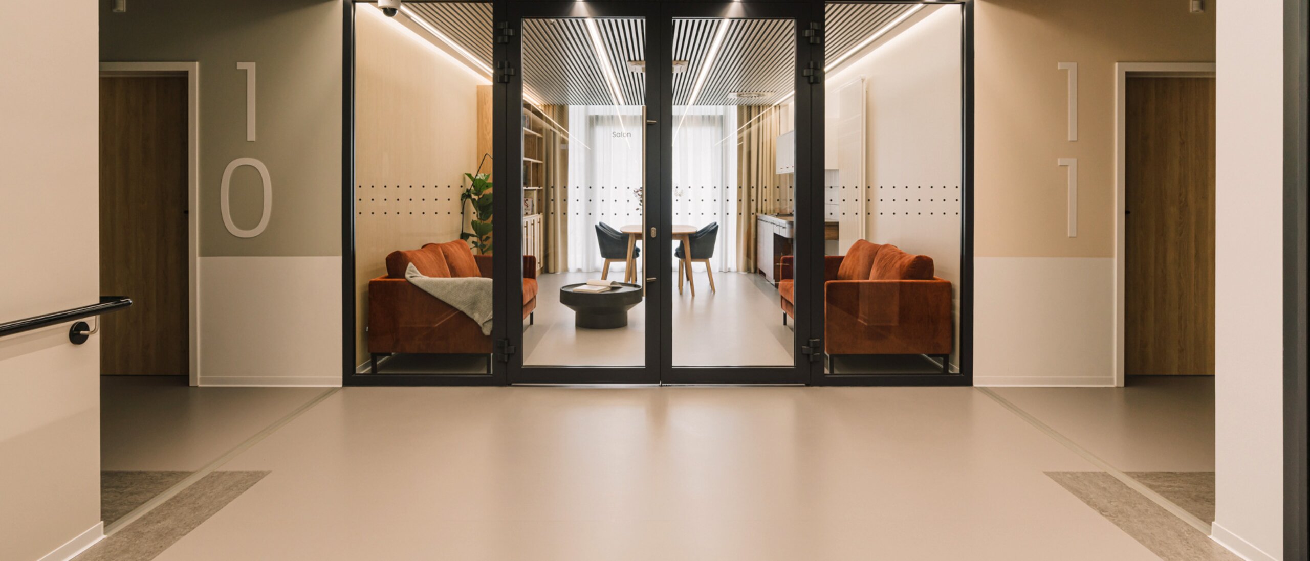 In line with the research approaches, the patient rooms provide plenty of space for personalisation using personal pictures and objects to stimulate the memory centres in the brain. The interior design also repeatedly refers to the style of the 1960s and 70s. Stimulating memory not only contributes to personal well-being, it also promotes adaptation to the new rooms and the spatial orientation of the elderly in the building. This is supported by dividing the building into different colour zones. The targeted use of colours and colour contrasts on stairs, doors and functional elements also makes it easier for people with visual impairments or dementia to see and perceive them.