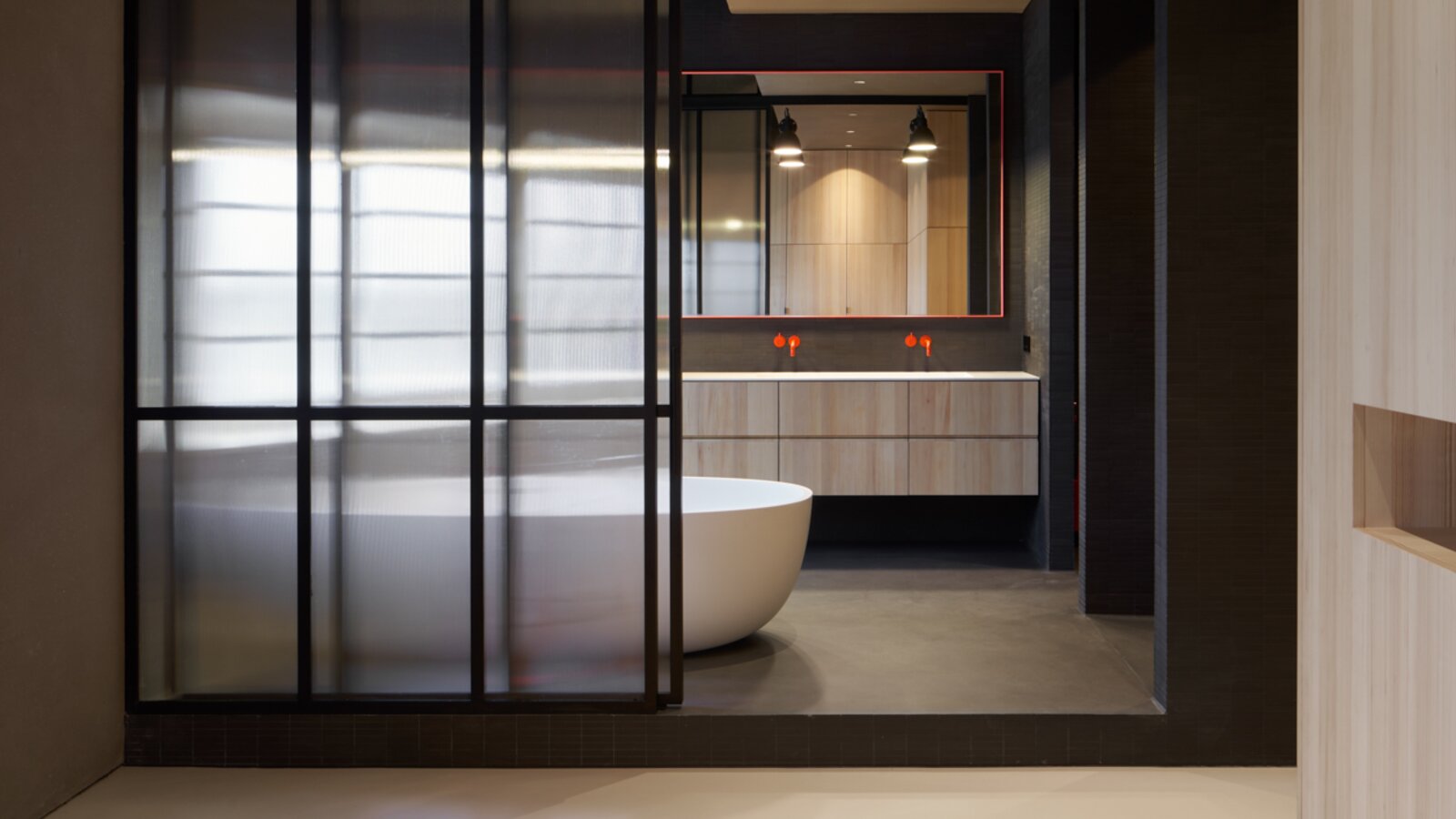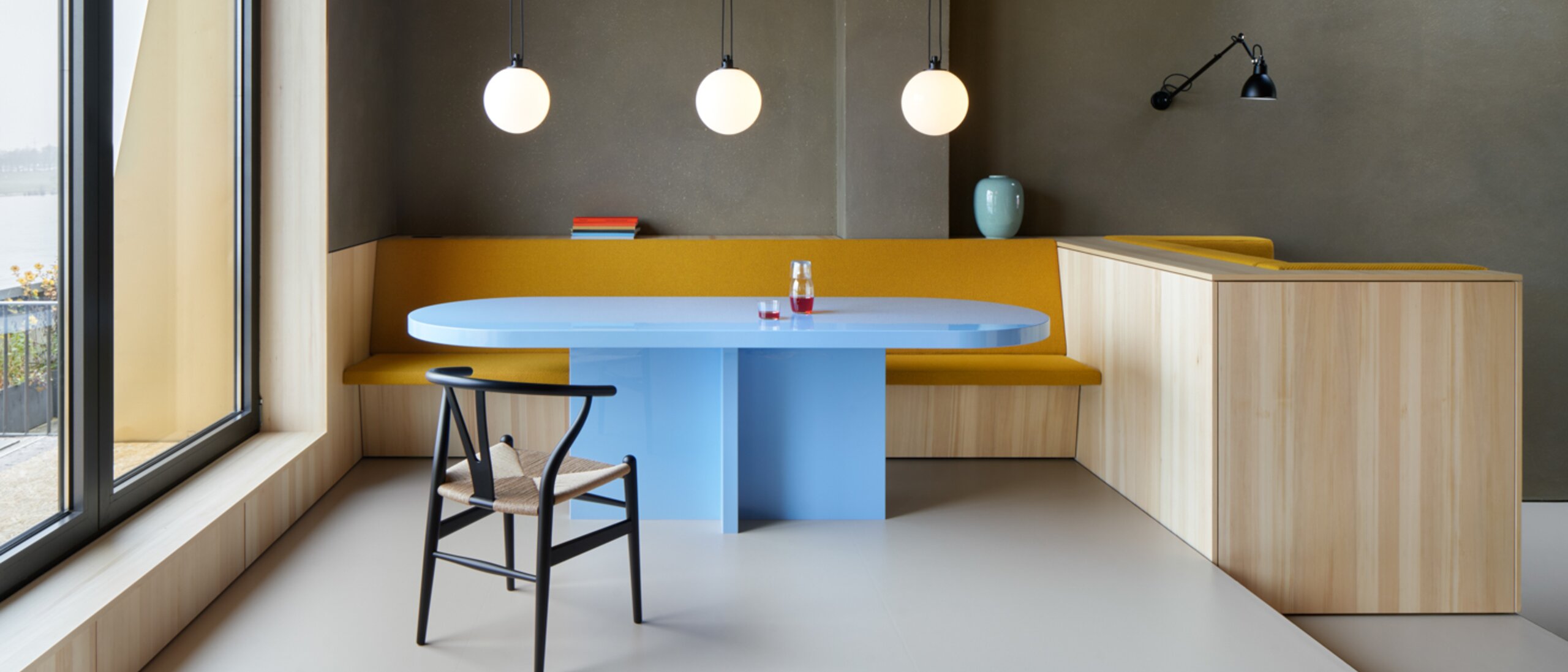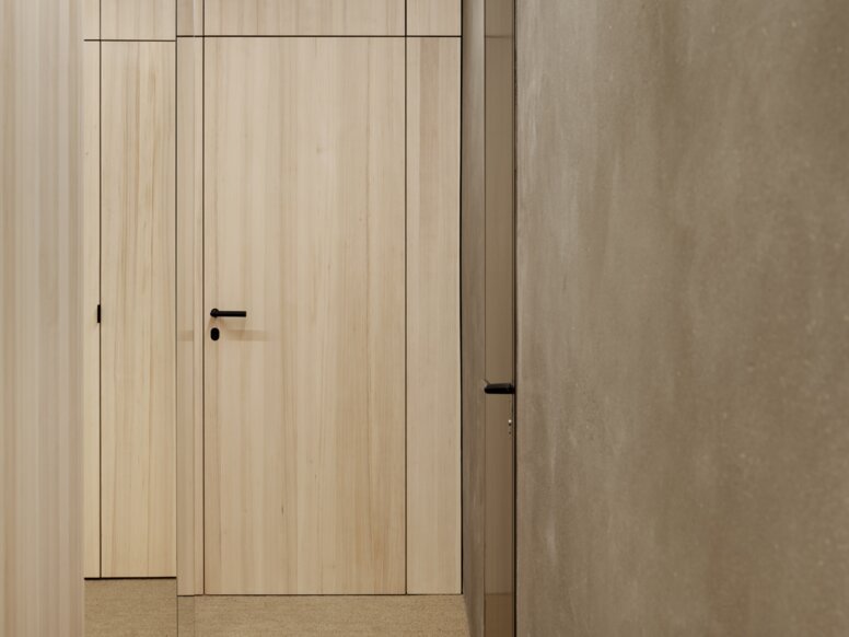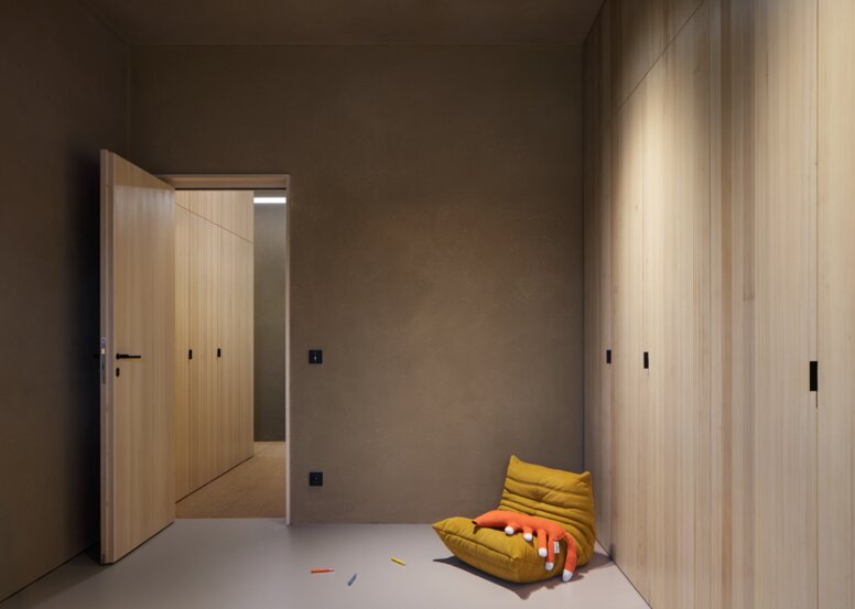 Trzypiętrowa jednostka mieszkalna została podzielona tak, aby część prywatna znajdowałasię na poziomie wejścia. Charakterystyczne są tu naturalne materiały, takie jak tynk gliniany w kolorze oliwkowym i regionalne drewno. Kauczukowa podłoga w kolorze kremowym przypomina bezspoinowe podłogi starych budynków przemysłowych, a jednocześnie tworzy harmonijne połączenie między glinianym tynkiem a drewnem. Na drugi poziom - centralną część mieszkania - prowadzi klatka schodowa efektownie pomalowana na błyszczacy pomarańczowy kolor. Tam mieści się przyjaznajadalnia z ławą do siedzenia pokrytą tkaniną i jasnoniebieskim stołem. Sama część mieszkalna todwupoziomowa przestrzeń z dużymi oknami, które wpuszczają mnóstwo naturalnego światła i oferują otwarty widok na Ren. Różne wysokości podestów tworzą dynamiczne poczucie przestrzeni, subtelnie oddzielając od siebie różne obszary mieszkalne.
