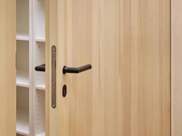 Do drzwi wybrano klamki drzwiowe HEWI System 162 w kolorze czarnym matowym które idealnie pasują do koncepcji projektowej loftu. Prosta, minimalistyczna forma klamki podkreśla nowoczesny charakter inwestycji i uzupełnia industrialną estetykę pierwotnego budynku magazynowego. Jednocześnie matowa czarna powierzchnia tworzy celowy kontrast z naturalnymi materiałami, takimi jak tynk gliniany i drewno, i harmonizuje z wyrazistymi akcentami - takimi jak pomalowana na pomarańczowo klatka schodowa. Te szczegóły ilustrują, jak dobrze przemyślane rozwiązania projektowe mogą przyczynić się do harmonii między starym i nowym.