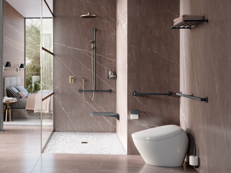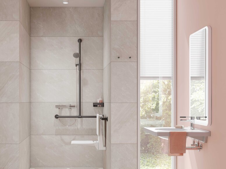 With shower seats, stools, support rails, hooks or shower holder systems, thermostats, shower curtains and shower shelves, you can design accessible showers and provide your customers with a comfortable showering experience.
