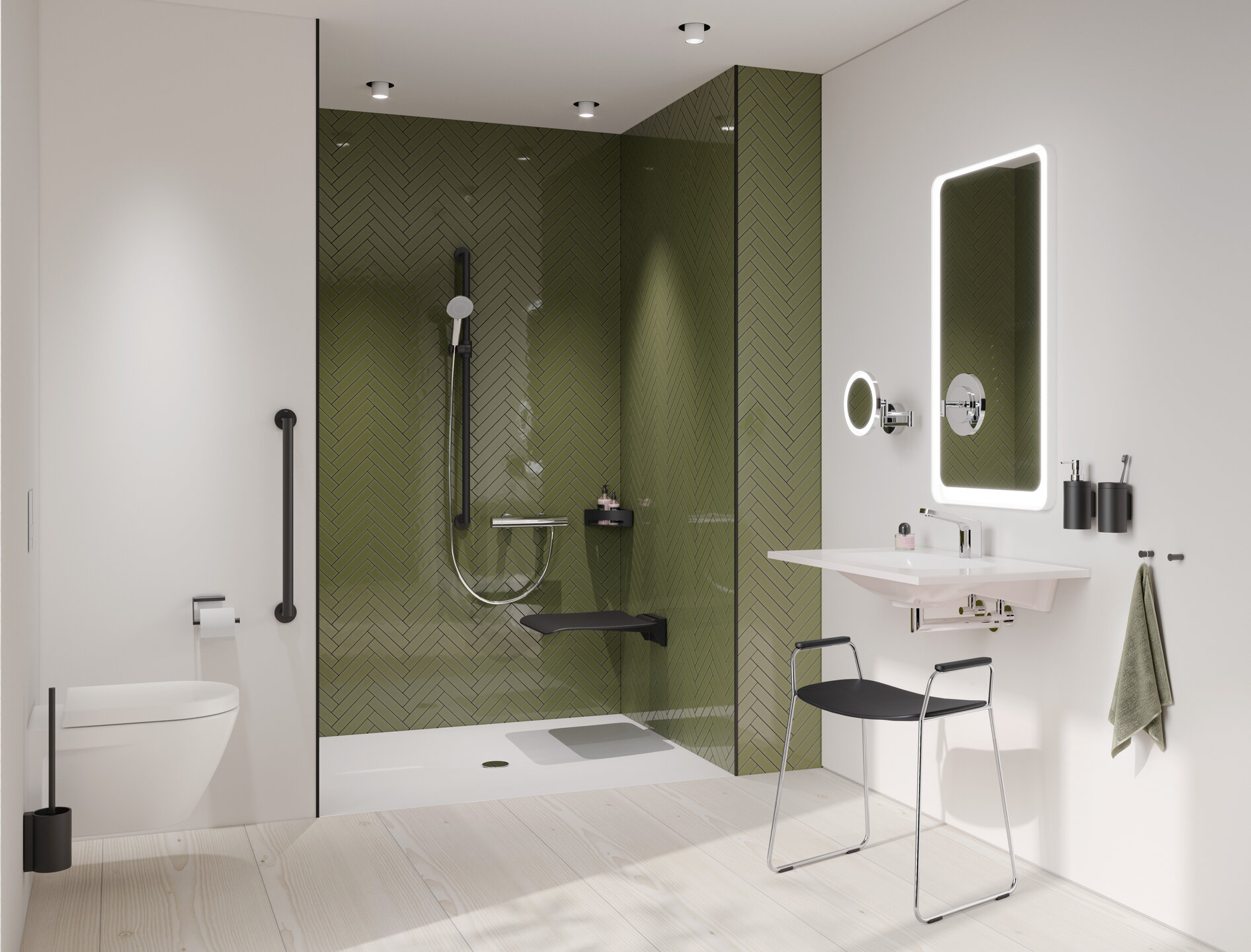 The stools and bath chairs can be flexibly positioned wherever they are needed. In the colours forest green and anthracite grey, the seats are real eye-catchers in your bathroom.