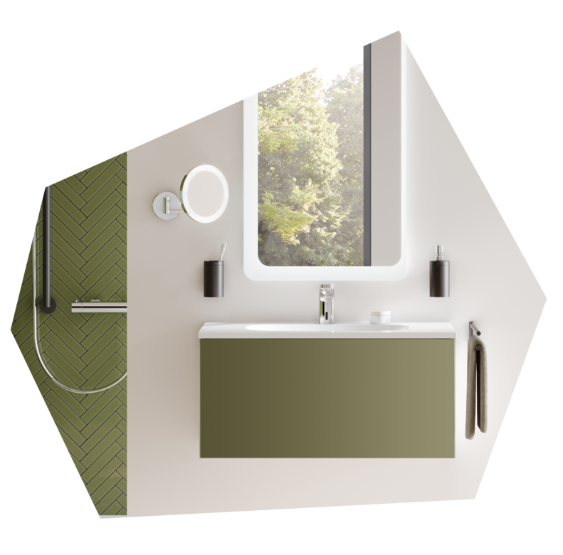 Our modular washbasin offers convenient support in everyday life and completes your barrier-free home. It has adaptive additional functions, such as a towel rail and storage surfaces. Products such as soap, toothbrushes and the like are always within easy reach.
