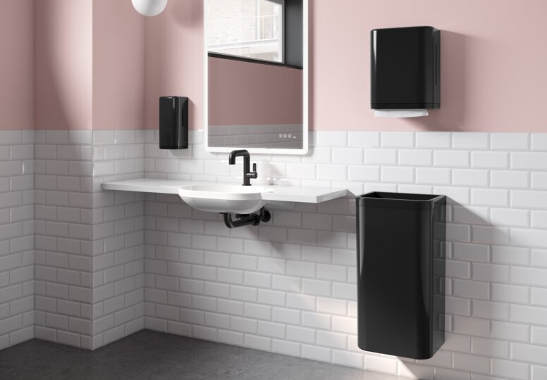 The new, shiny dispenser products in black complement the successful 477/801 sanitary range. From soap and paper towel dispensers to hygiene combinations and wastebins in various sizes, HEWI offers a continuous, functional range that is also characterized by the highest design standards. In addition to manually operated variants, some of the dispensers are also available in a sensoric version.