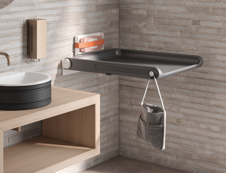 The new HEWI baby changing table combines an easy-to-clean lying surface made of PUR foam in iron grey with robust metal components in matt grain white. The braked fold-down function enables smooth handling, while side hooks and a clamp compartment offer additional comfort and convenience. The changing table combines the highest safety standards and comfortable handling with a modern design that blends seamlessly into public sanitary areas. The baby changing table was designed by Holscher Design, a renowned and award-winning strategic product design agency from Denmark with over 50 years of experience.