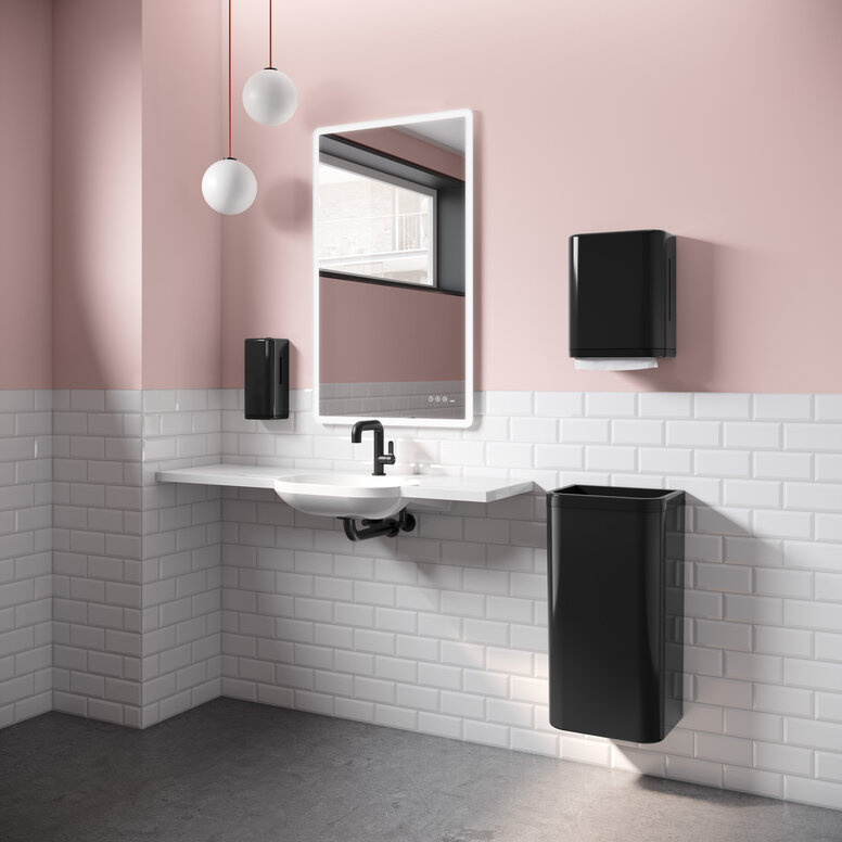 De nieuwe, glanzende dispenserproducten in de kleur zwart vormen een aanvulling op de succesvolle sanitairserie 477/801. Van zeep- en papieren handdoekdispensers tot hygiënecombinaties en afvalbakken in verschillende afmetingen: HEWI biedt een consistent, functioneel assortiment dat bovendien wordt gekenmerkt door de hoogste designnormen.