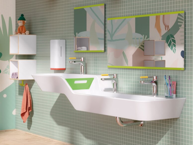 HEWI Bad-Armaturen sind besonders einfach zu bedienen – insbesondere für Kinder. Verschiedene Bedienformen schulen die kindliche Motorik. HEWI Einhebel-Waschtischmischer verfügen über nur ein Bedienelement. Über den leichtgängigen Bedienhebel stellen Kinder die Wassermenge präzise ein. Zugleich wählen die kleinen Nutzenden die Wassertemperatur ihrem Bedürfnis entsprechend.